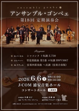 アンサンブル・ゴンベェ 第18回 定期演奏会 日時 2026年6月6日(土) 14:00開場 14:30開演 会場 コンサートホール 出演者 アンサンブル・ゴンベェ 曲目 ヘンリー・パーセル:シャコンヌ ト長調 Z.730 バッハ:管弦楽組曲 第2番 ロ短調 BWV1067 ラヴェル:弦楽四重奏曲 ヘ長調 チケット 入場無料 備考 お問合せ <電話>047-354-4369 <メール>ens.gonbe@gmail.com 担当:佐藤