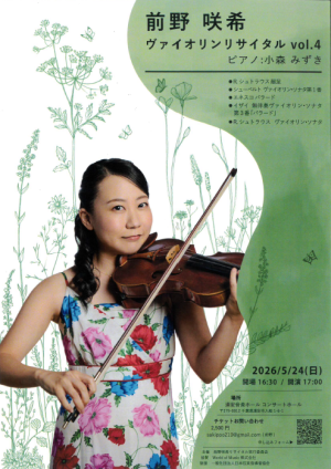 前野咲希 ヴァイオリンリサイタルVol.4 日時 2026/5/24(日) 16:30開場 17:00開演 会場 コンサートホール 出演者 前野咲希(ヴァイオリン) 小森みずき(ピアノ) 曲目 ・R.シュトラウス献呈 ・シューベルト ヴァイオリン・ソナタ第1番 ・エネスコバラード ・イザイ 無伴奏ヴァイオリン・ソナタ 第3番「バラード」 ・R.シュトラウス ヴァイオリン・ソナタ チケット 全席自由2,500円 備考 チケットお問合せ <メール>sakippo210@gmail.com 担当:前野