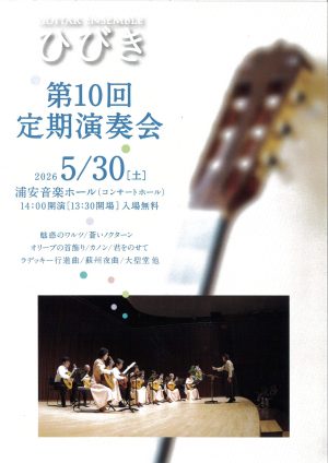 GUITAR ENSEMBLE ひびき 第10回定期演奏会 日時 2026年5月30日(土) 13:30開場 14:00開演 会場 コンサートホール 出演者 GUITAR ENSEMBLE ひびき 曲目 魅惑のワルツ 蒼いノクターン オリーブの首飾り カノン 君をのせて ラデッキー行進曲 蘇州夜曲 大聖堂 他 チケット 入場無料